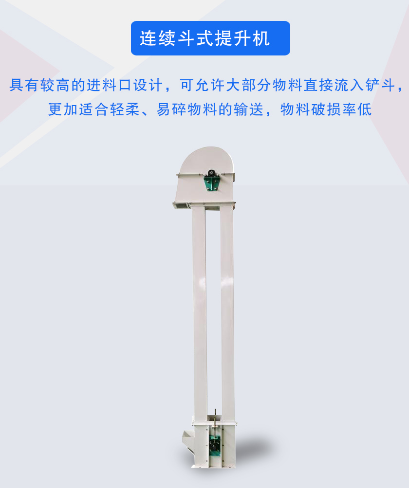 连续斗式提升机简称连续式提升机,是利用料斗和牵引件进行物料输送的设备,连续斗式提升机采用比较慢的速度运行,具有较高的进料口设计,可允许大部分物料直接流入铲斗,更加适合轻柔、易碎物料的输送,物料破损率低,对于较大和较重的块状物和高磨蚀性材料也是理想的选择,根据牵引件的不同主要分为链条式和皮带式两种。