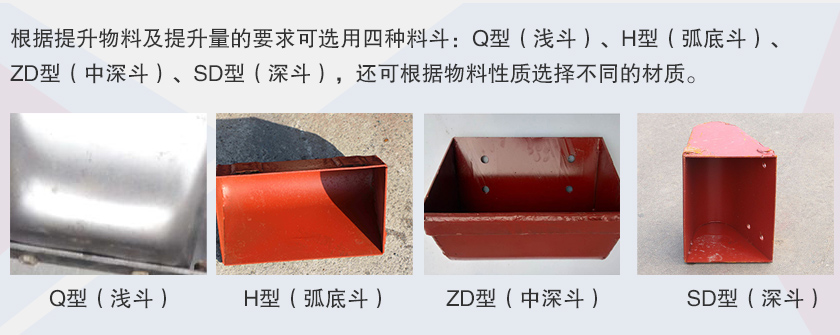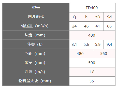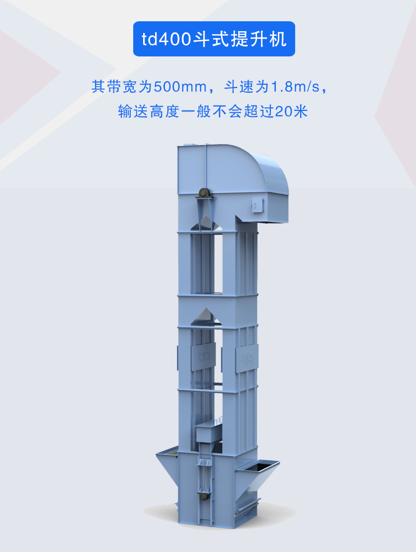 td400斗式提升机斗宽为400mm的一种斗式提升机,采用橡胶带作为其传动部分,其带宽为500mm,斗速为1.8m/s,普通皮带的斗式提升机正常输送高度一般不会超过20米,钢丝绳芯的皮带斗式提升机的输送高度高达80米。根据提升物料及提升量的要求可选用四种料斗:Q型(浅斗)、H型(弧底斗)、ZD型(中深斗)、SD型(深斗),还可根据物料性质选择不同的材质。