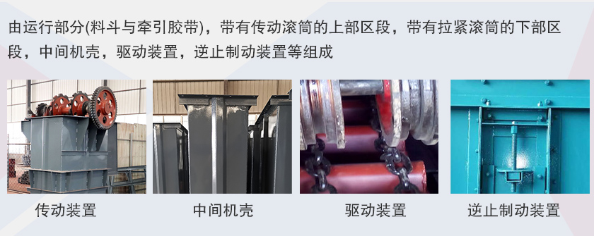 td斗式提升机牵引件为橡胶带,料斗以一定的间隔固定在橡胶带上,橡胶带分别绕过提升机头部和底部的滚筒,构成具有上升有载分支和下降无载分支的闭合环形系统;工作时,布置在提升机头部的驱动装置通过头部滚筒将动力传给橡胶带和料斗,物料从提升机底部的进料口进入料斗,料斗将物料提升至头部的卸料口,在离心力和重力的共同作用下,料斗中的物料经卸料口卸出。