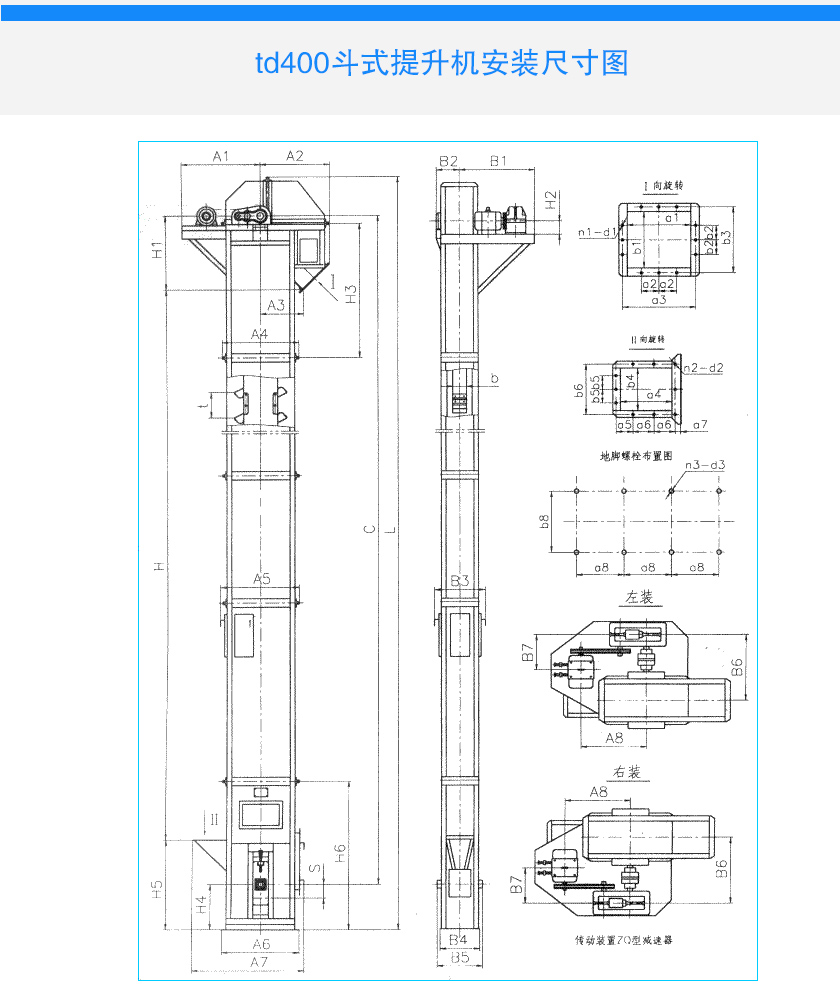td400斗式提升机由运行部分(料斗与牵引胶带),带有传动滚筒的上部区段,带有拉紧滚筒的下部区段,中间机壳,驱动装置,逆止制动装置等组成,传动装置有两种形式,分别配有YZ型减速器、ZQ(或YY)型减速器,YZ型轴减速器直接是安装在主轴轴头上,省去了提升机传动平台、联轴器等,结构更为紧凑,重量轻,内部安装有异型逆止器,逆止可靠。