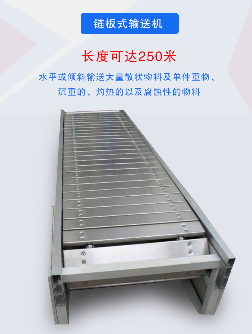 链板式输送机是利用固接在牵引链上的一系列链条提供牵引力,用金属板做为承载体使物料在水平或倾斜方向上输送。