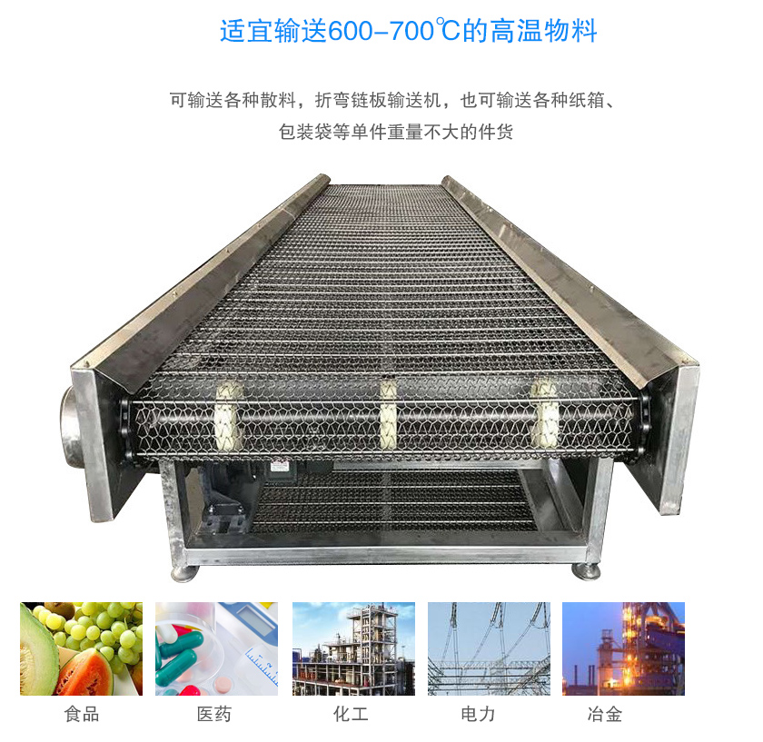 链板输送机采用链板输送带180°链板输送机用于衔接,与其他输送设备配合使用能充分节省空间并能起到良好的输送效果。转弯角度可分:60°、90°、180°??墒渌偷奈锪现掷喾倍啵瓤墒渌透髦稚⒘?,折弯链板输送机,也可输送各种纸箱、包装袋等单件重量不大的件货,广泛应用于食品、医药、化工、电力、冶金等行业,适宜输送600-700℃的高温物料。