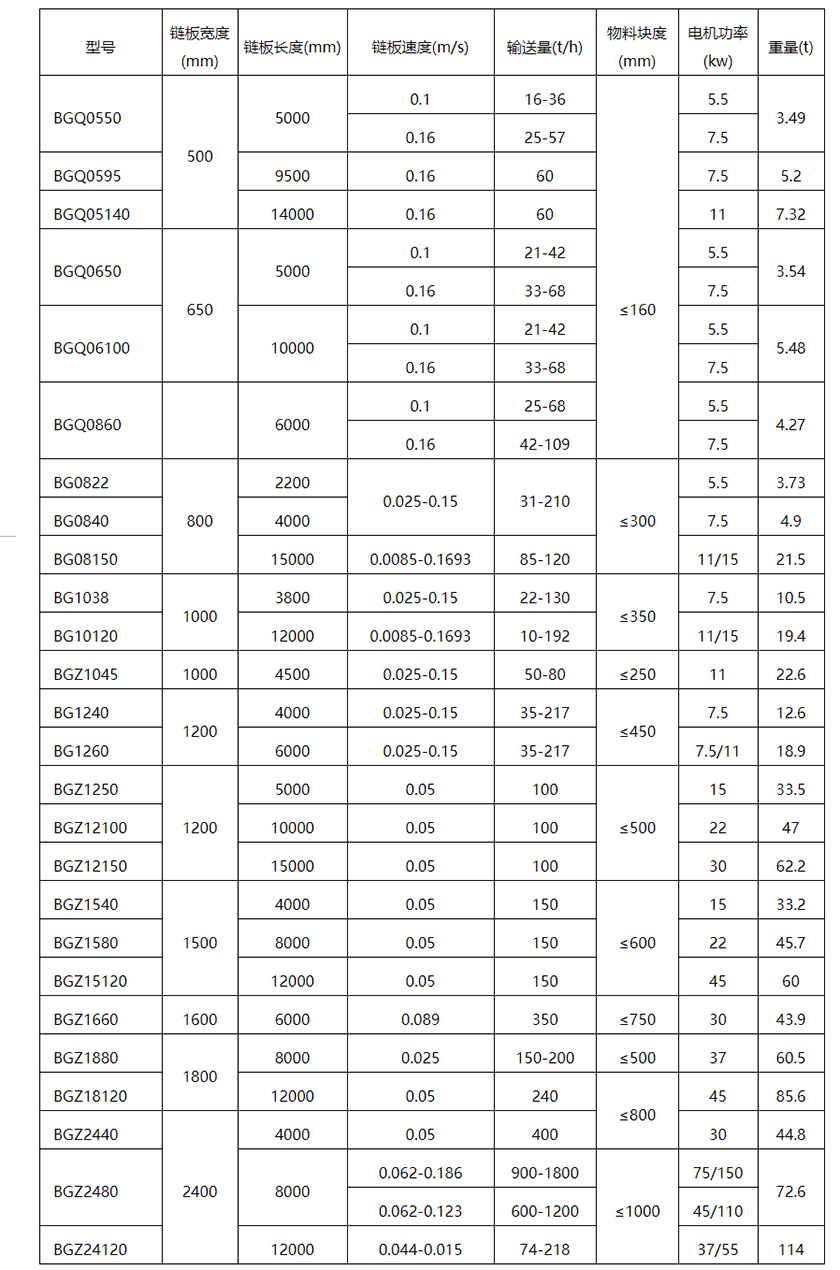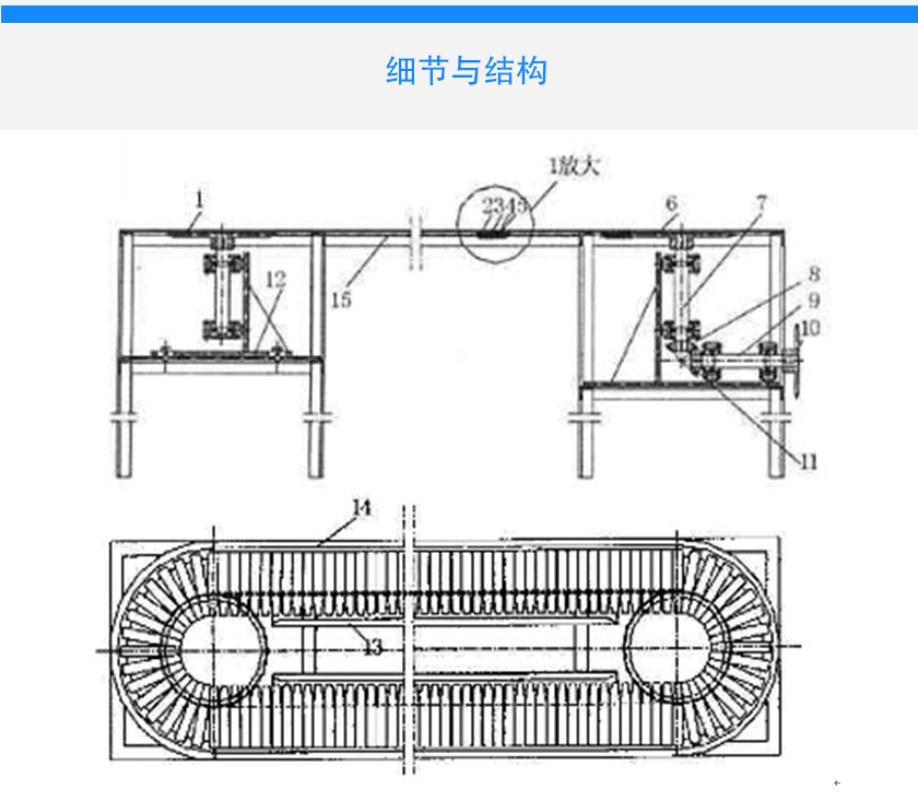 2、采用板式链条做牵引件,拉力强,刚性好,耐冲击型强。
