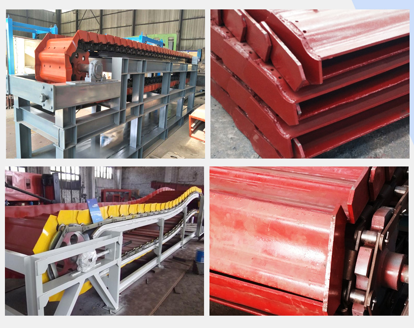 鳞板输送机主要由头轮装置、链板组合装置、尾轮组合装置、尾轮张紧装置、机架、驱动装置组成。