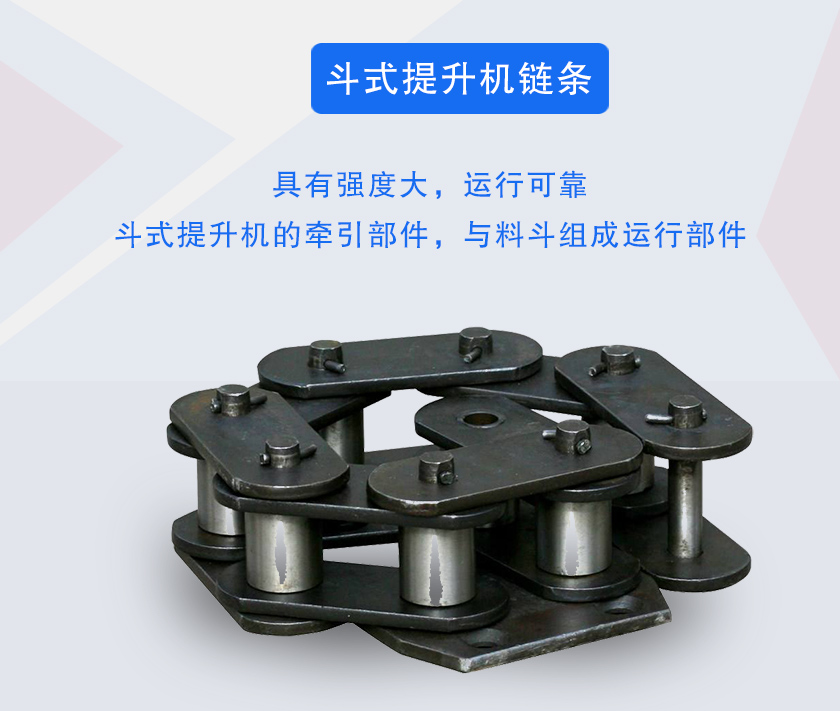 斗式提升机链条是斗式提升机的牵引部件,与料斗组成运行部件,具有强度大,运行可靠的特点。