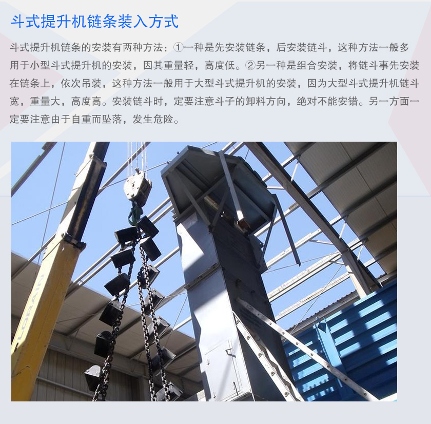 斗式提升机链条的安装有两种方法:①一种是先安装链条,后安装链斗,这种方法一般多用于小型斗式提升机的安装,因其重量轻,高度低。②另一种是组合安装,将链斗事先安装在链条上,依次吊装,这种方法一般用于大型斗式提升机的安装,因为大型斗式提升机链斗宽,重量大,高度高。安装链斗时,定要注意斗子的卸料方向,不能安错。另一方面一定要注意由于自重而坠落,发生危险。