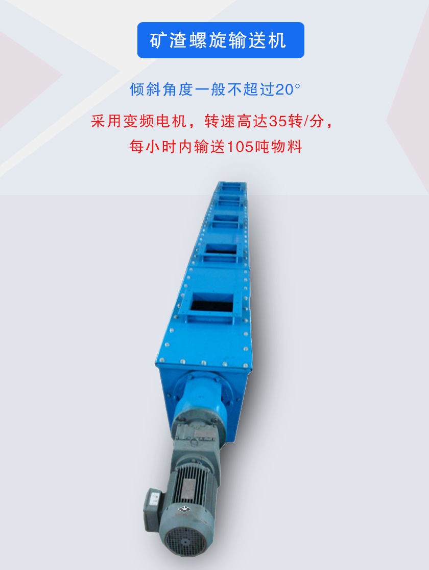 矿渣螺旋输送机是一种用于输送和处理矿渣的设备,矿渣螺旋输送机倾斜角度一般不超过20°,它采用变频电机,转速高达35转/分,设备耐磨性好,锁风功能强,进而减少了能源的消耗。
