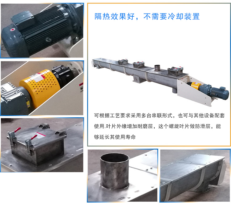 矿渣螺旋输送机是由驱动装置、螺旋、头部轴承、尾部轴承、悬挂轴承、机盖、底座等组成。驱动装置:由电动机、减速器、联轴器等组成。螺旋轴与吊轴承、头部轴承、尾部轴承联接采用嵌入舌式,安装拆卸不需轴向移动,维修方便,采用变径结构,增大吊轴承处的容积,避免吊轴承与物料接触,各传动部位采用浮动联接方式,头尾轴承座均在壳体外,所有轴承采用多层密封和配合密封技术,轴承使用寿命长。