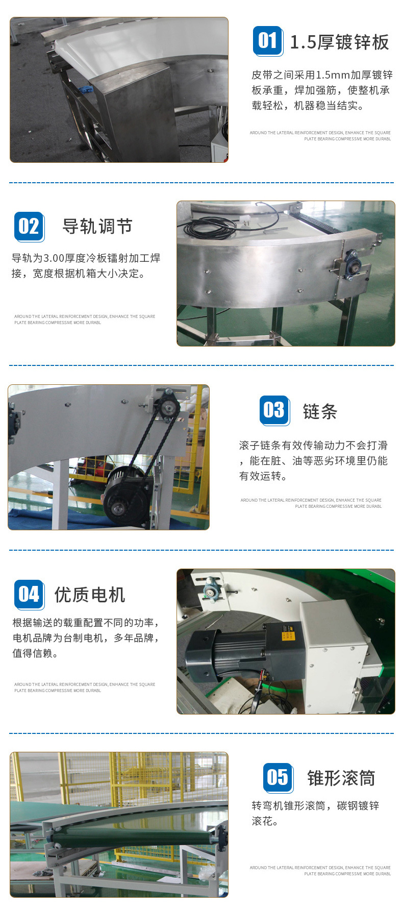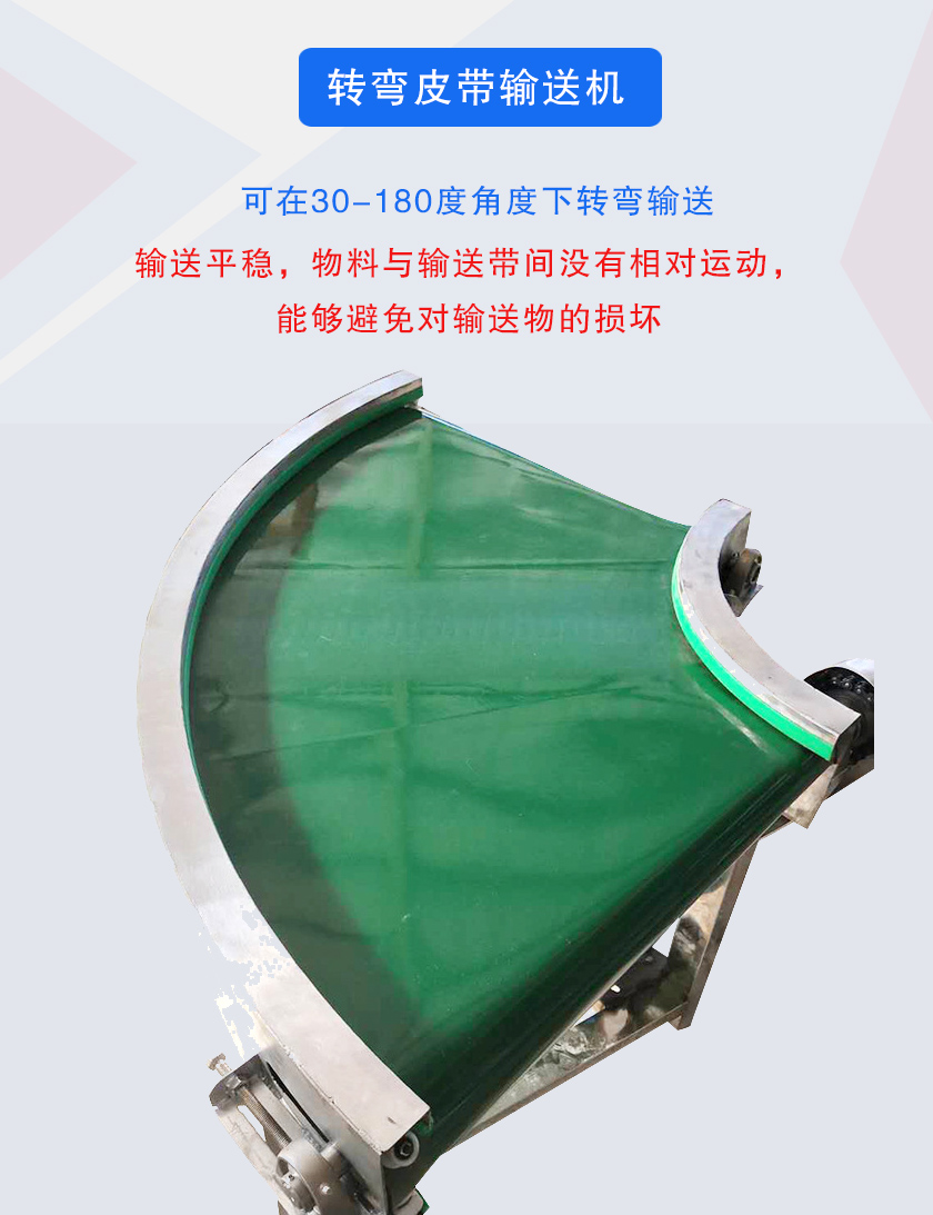转弯皮带输送机简称转弯皮带机,是输送流水线中使用比较广泛的一种设备,用于输送带与输送带之间弯角的连续或间歇运动来输送各种轻重不同的物料,常见的角度为30°,45°,90°和180°,能够满足各种转弯输送的工艺要求,转弯皮带输送机输送带可根据输送物料的性质选择PVC、PU材质,除输送普通物料外,还可选择满足耐油、耐腐蚀、防静电等特殊物料输送的皮带材质,转弯皮带输送机机架采用碳钢或不锈钢材质制作,驱动电机可根据用户需求安装在机架上面或者下面,有速度调节幽囚的用户还可选择变频调速或无级变速减速电机。