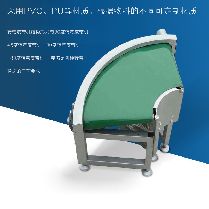 转弯皮带输送机简称转弯皮带机可30°,45°,90°和180°输送物料,转弯皮带输送机输送带可根据输送物料的性质选择PVC、PU材质,除输送普通物料外,还可选择满足耐油、耐腐蚀、防静电等特殊物料输送的皮带材质.