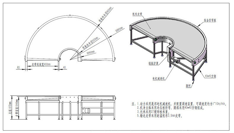 1、相较普通输送机增加转弯功能,可满足各种输送工艺要求。