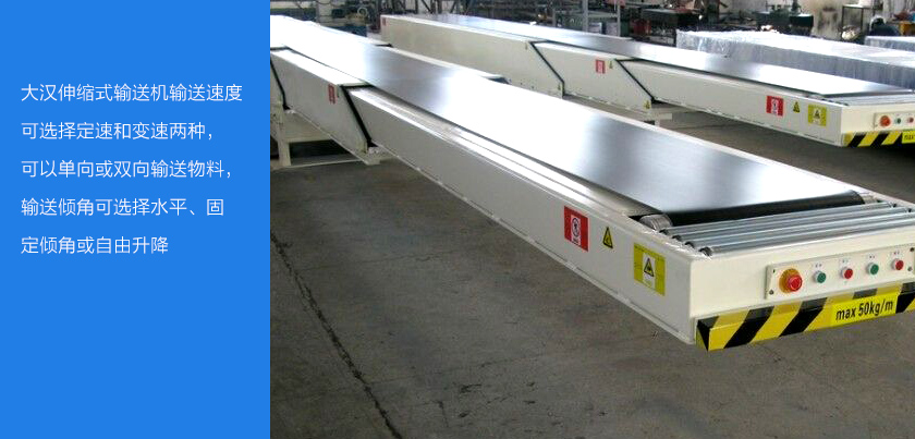 大汉伸缩式输送机输送速度可选择定速和变速两种,可以单向或双向输送物料,输送倾角可选择水平、固定倾角或自由升降