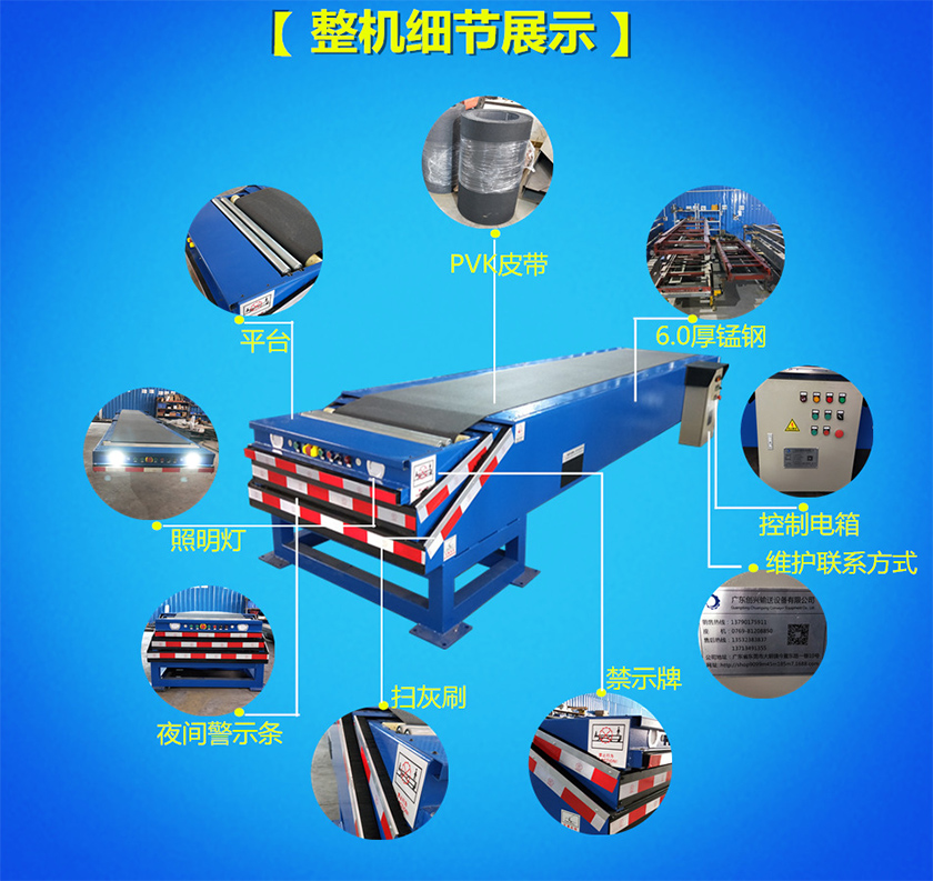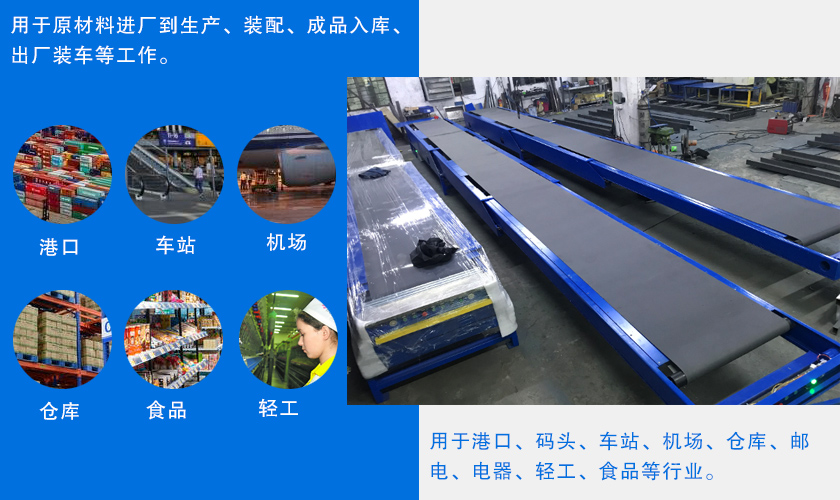 伸缩式皮带输送机可应用于港口、码头、车站、机场、仓库、邮电、电器、轻工、食品等行业。完成物品或零件的传输,装卸工作,使用于原材料进厂到生产、装配、成品入库、出厂装车等工作。