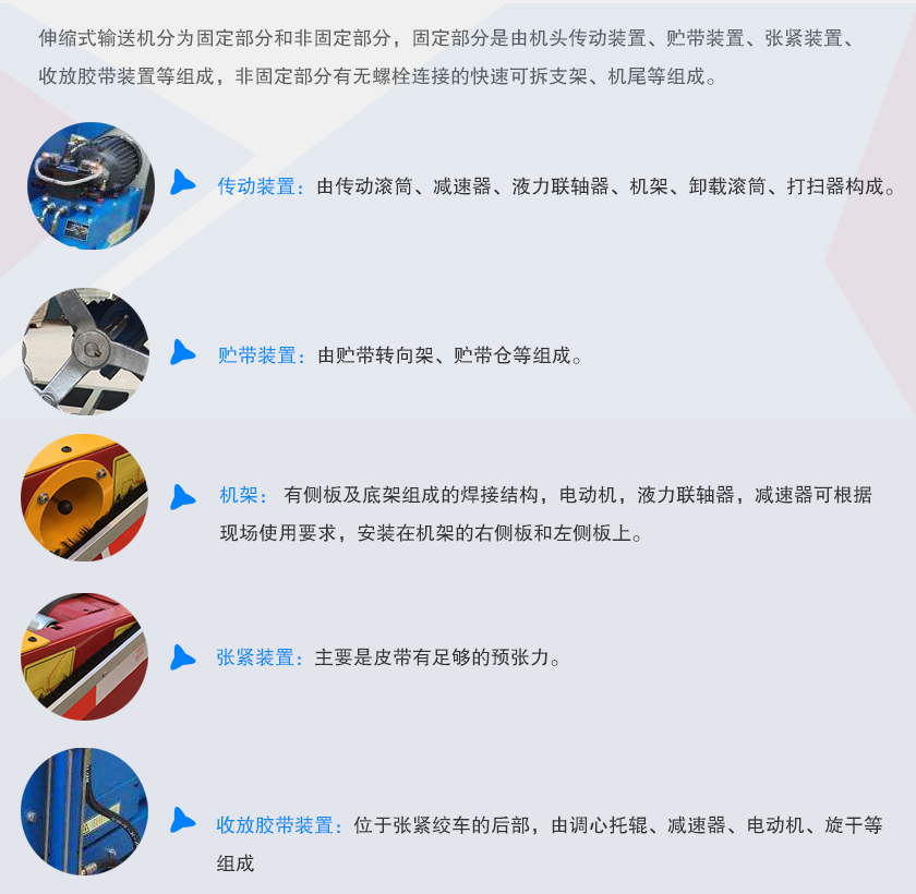 伸缩式输送机分为固定部分和非固定部分,固定部分是由机头传动装置、贮带装置、张紧装置、收放胶带装置等组成,非固定部分有无螺栓连接的快速可拆支架、机尾等组成。
