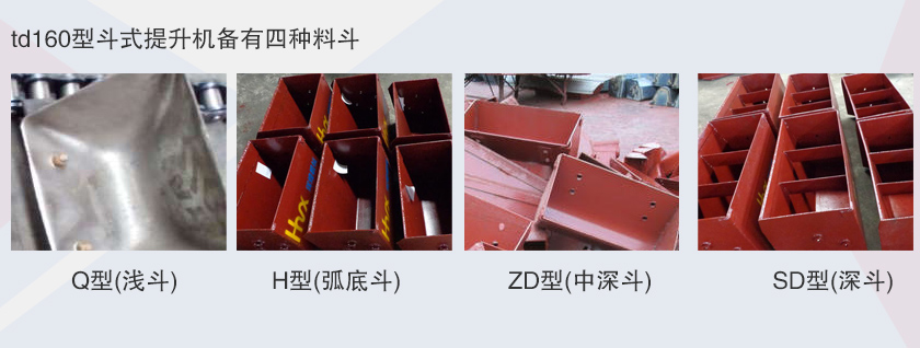 td160斗式提升机斗宽为160mm,斗速为1.4米/秒,是一种小型td斗式提升机,可以垂直输送粉状、颗粒状及小块状的磨琢性散装物料,td160型斗式提升机备有四种料斗Q型(浅斗)、H型(弧底斗)、ZD型(中深斗)SD型(深斗)。