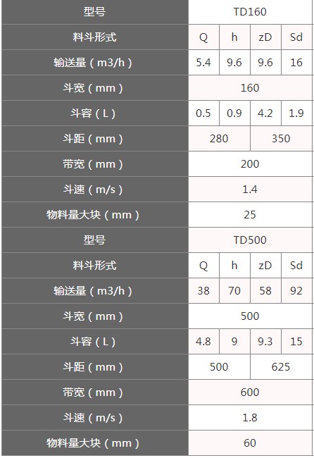 1、表中斗容为计算斗容,输送量按填充系数0.6计算得出。