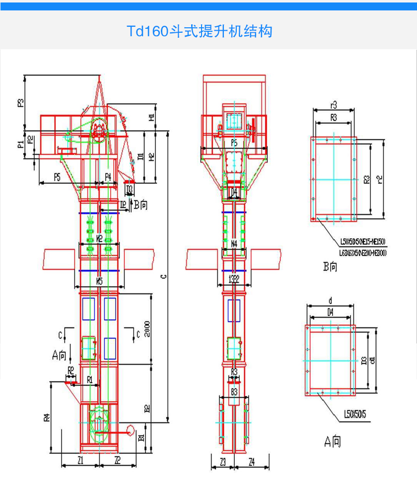 td160斗式提升机斗宽为160mm,垂直输送粉状、颗粒状及小块状的磨琢性散装物料,每小时输送量可达5.4-16立方,可根据物料性质选择碳钢或不锈钢材质.