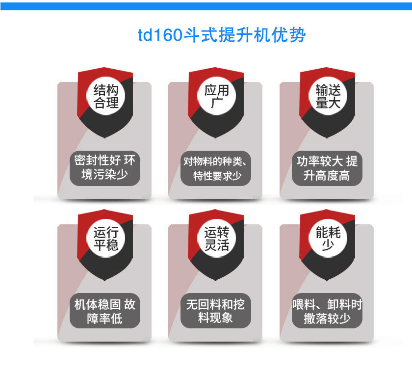 td160斗式提升机主要用于食品、化工、尖刺、冶金、煤炭等行业,适用于垂直输送粉末、颗粒、小块状或磨琢性较小的散装物料,如粮食、煤、水泥、碎矿石等物料。