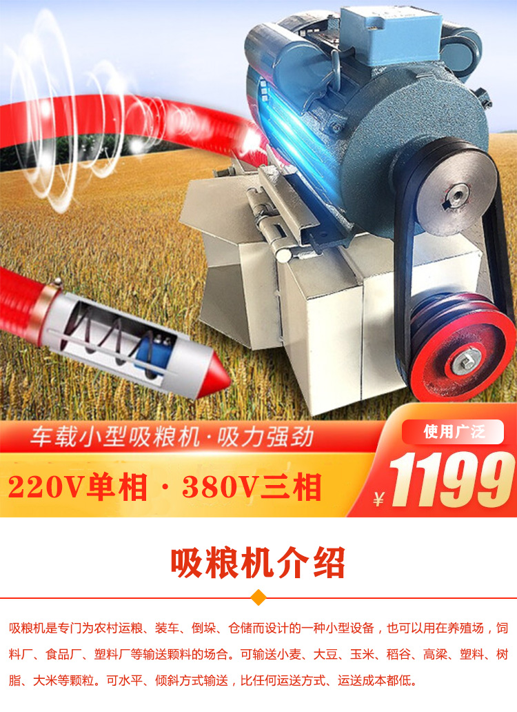 吸粮机可水平、斜向、垂直输送物料,单机独立完成输送任务。