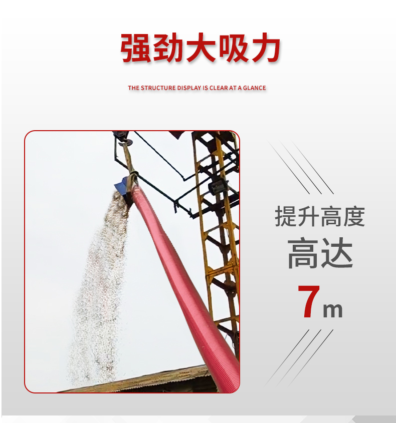 车载吸粮机一般主要由进料口、牛津管、无轴螺旋、出料口、机座、电机(汽柴油机、蜗轮减速机)等部分组成。当物料均匀适量地由进料口进入牛津管后,电机(汽柴油机)通过皮带轮带动螺旋片旋转,螺旋将物料输送至机箱一端的出料口,然后落入车厢、仓库、尼龙袋等物料接收处。效率可达每小时25吨,提升高度8米。水平距离为6-30米工作时软管弯曲半径不得小于一米。