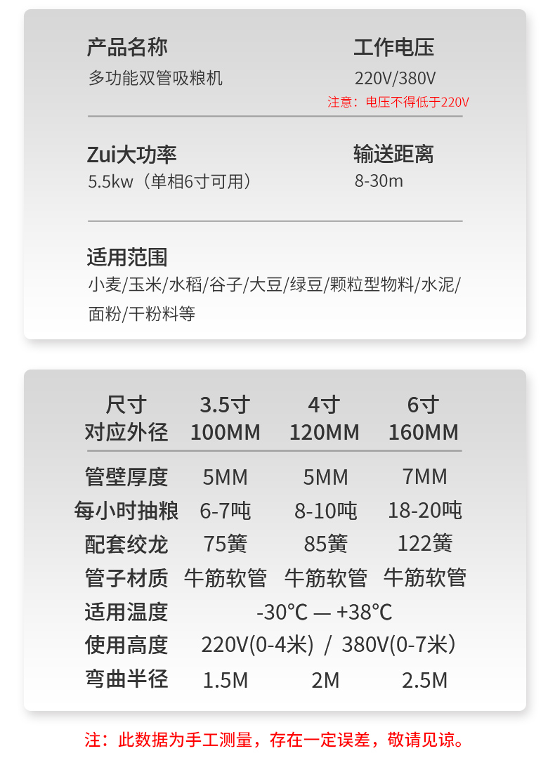 机器7m以下可使用3kw两相/3KW三相铜线电机,8m-12m之间可使用4kw三相电铜线电机,一般情况下,220V垂直高度3米,380V垂直高度4米(数据一般以粮食为准)