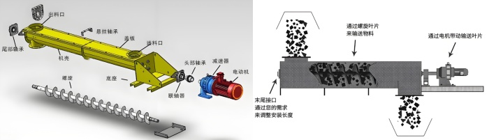 简单来说,其过程可以理解为:旋转叶片 → 推动物料 → 物料沿轴向前进 → 连续排出。当输送机水平布置时,主要依靠叶片的机械推力;当倾斜或垂直布置时,还需克服部分重力影响,因此输送效率会有所变化。