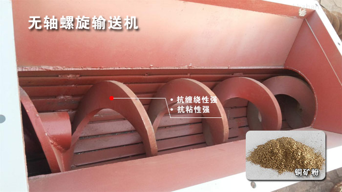 无轴螺旋输送机适用于输送的物料:污泥、生活垃圾、铜矿粉、格栅渣等有粘性,缠绕性物料和块状物料,正是因为无轴螺旋输送机无中心轴的设计对这些物料具有很大的优势。