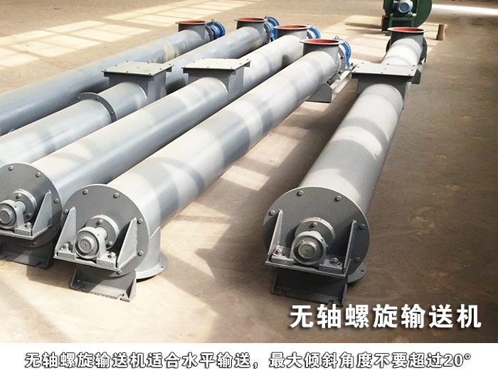 无轴螺旋输送机适合水平输送,倾斜角度不要超过20°(根据实际的使用情况而言。)