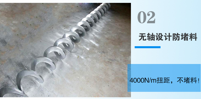 无轴螺旋输送机其扭距可达4000N/m,所以物料不易堵塞,排料口也出现不堵塞,因而可以降低螺旋机的运转速度使其平稳传动,从而达到降低能耗的效果。无轴螺旋输送机输送量大,输送量是相同直径传统有轴螺旋输送机的1.5倍。