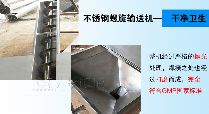 我们公司生产的不锈钢螺旋输送机采用精选304、316、316L等不同等级的不锈钢材质,并且整机经过严格的抛光处理,焊接之处也经过打磨而成,符合食品行业卫生要求。