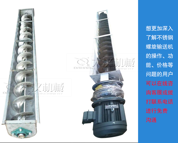 以上就是大汉小编为您介绍的输送葡萄干所用的不锈钢螺旋输送机,想更加深入了解不锈钢螺旋输送机的操作、功能、价格等问题的用户可以在线咨询客服或拨打联系电话进行免费沟通。