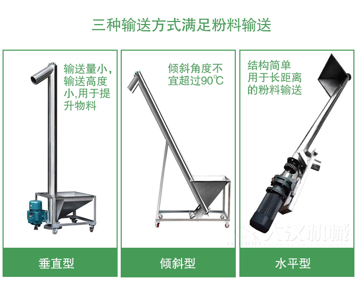 垂直型管式螺旋输送机——输送量小,输送高度小,转速较高,能耗大。特别适宜输送流动性好的粉粒状物料,主要用于提升物料,提升高度一般不大于8米。