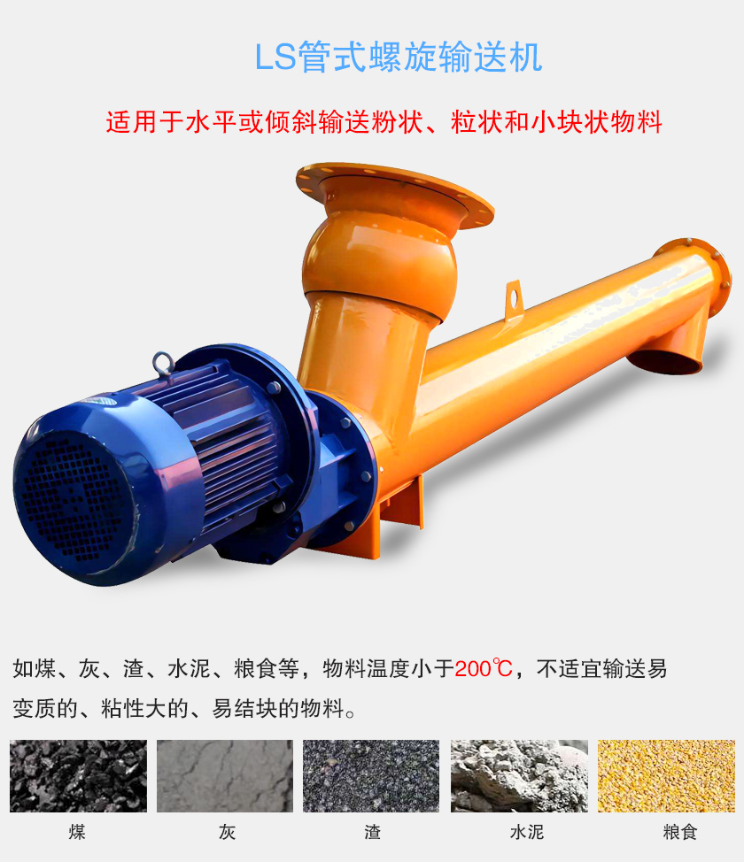 LS管式螺旋输送机适用于水平或倾斜输送粉状、粒状和小块状物料,如煤、灰、渣、水泥、粮食等,物料温度小于200℃,不适宜输送易变质的、粘性大的、易结块的物料。