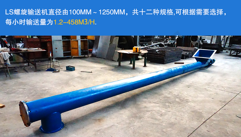 LS螺旋输送机直径由100mm~1250mm,共十二种规格,分为单驱动和双驱动两种形式,单驱动螺旋机长度可达40m(特大型30m),双驱动螺旋机采用中间断开轴结构,长度可达80m(特大型60m),螺旋机长度每 0.5m 一档,可根据需要选择,每小时输送量为1.2-458m³/h.