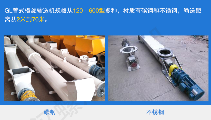 GL管式螺旋输送机规格从120-600型多种,材质有碳钢和不锈钢,输送距离从2米到70米。