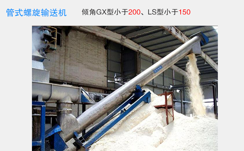 管式螺旋输送机可布置成水平或倾斜输送形式(倾角GX型小于200°、LS型小于150°)。