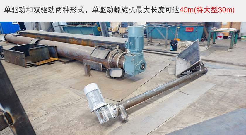 管式螺旋输送机分为单驱动和双驱动两种形式,单驱动螺旋机长度可达40m(特大型30m),双驱动螺旋机采用中间断开轴结构,长度可达80m(特大型60m),螺旋机长度每 0.5m 一档,可根据需要选定。
