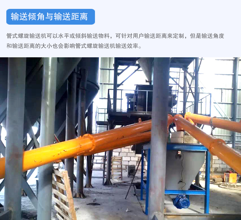 管式螺旋输送机可以水平或倾斜输送物料,可针对用户输送距离来定制,但是输送角度和输送距离的大小也会影响管式螺旋输送机输送效率。