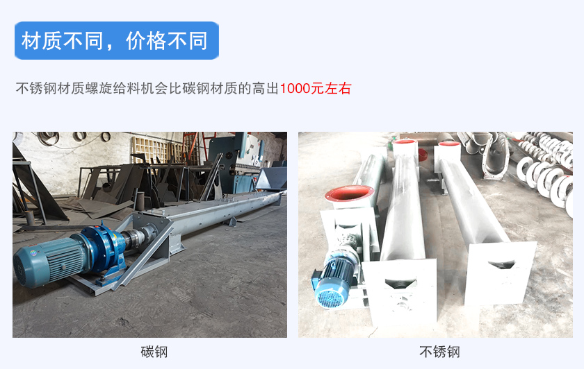 螺旋给料机可以分为碳钢和不锈钢材质两种,碳钢螺旋给料机适合普通物料输送,不锈钢螺旋给料机主要用于输送机一些腐蚀性、高温物料,不锈钢材质螺旋给料机会比碳钢材质的高出1000元左右。